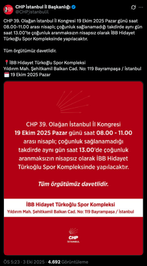 CHP’nin 39. Olağan İstanbul İl Kongresi, 19 Ekim Pazar günü İBB Hidayet Türkoğlu Spor Kompleksi’nde toplanacak. İlk oturum 08.00–11.00 saatleri arasında nisaplı yapılacak, çoğunluk sağlanmazsa kongre aynı gün 13.00’te nisapsız düzenlenecek.