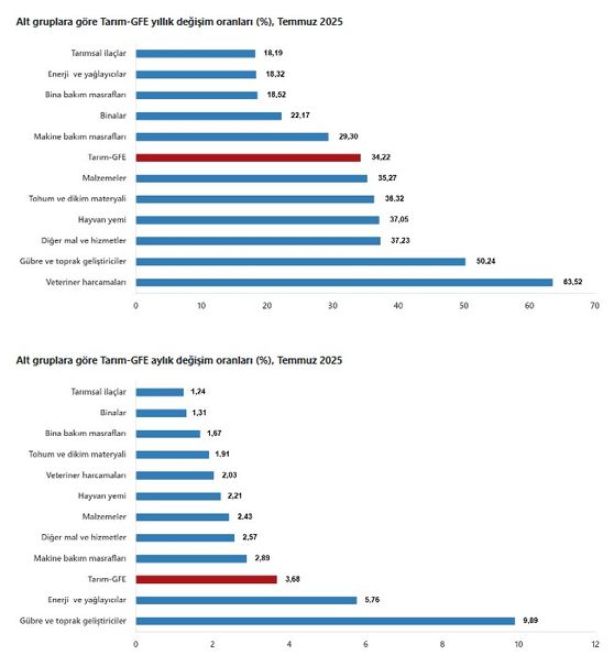 Yıllık değişimin en yüksek olduğu alt grup yüzde 63,52 artış ile veteriner harcamaları, aylık değişimin en yüksek olduğu alt grup yüzde 9,89 artış ile gübre ve toprak geliştiriciler oldu. Aylık bazda gübrenin ardından en sert yükseliş yüzde 5,76 artışla enerji ve yağlayıcılar grubunda yaşandı.